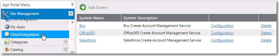 1. On the Admin tab, select Site Management > Cloud Integration. The Cloud Integration view opens, listing the available services of the connected cloud applications.