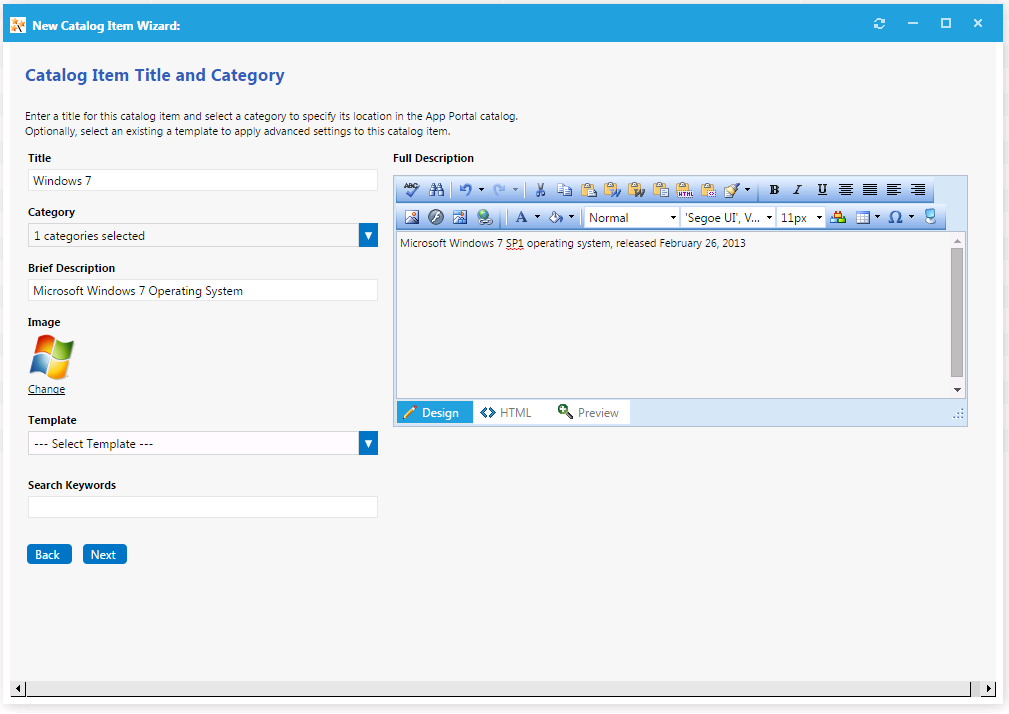 • Title—The text entered in the Title field along with the catalog item icon, will be displayed when viewing this catalog item on the Browse Catalog tab.